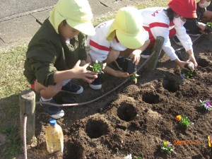 子どもたちが、花壇にパンジーとビオラを植えてくれました。